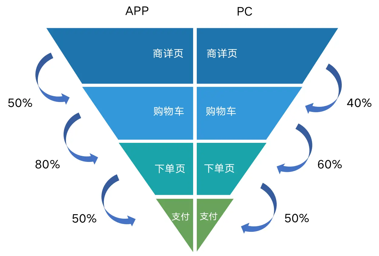 比如:对于电商产品来说,最终目的是让用户购买商品,但整个流程的转化率由每一步的转化率综合而定。这时,我们就可以通过漏斗分析模型进行监测。