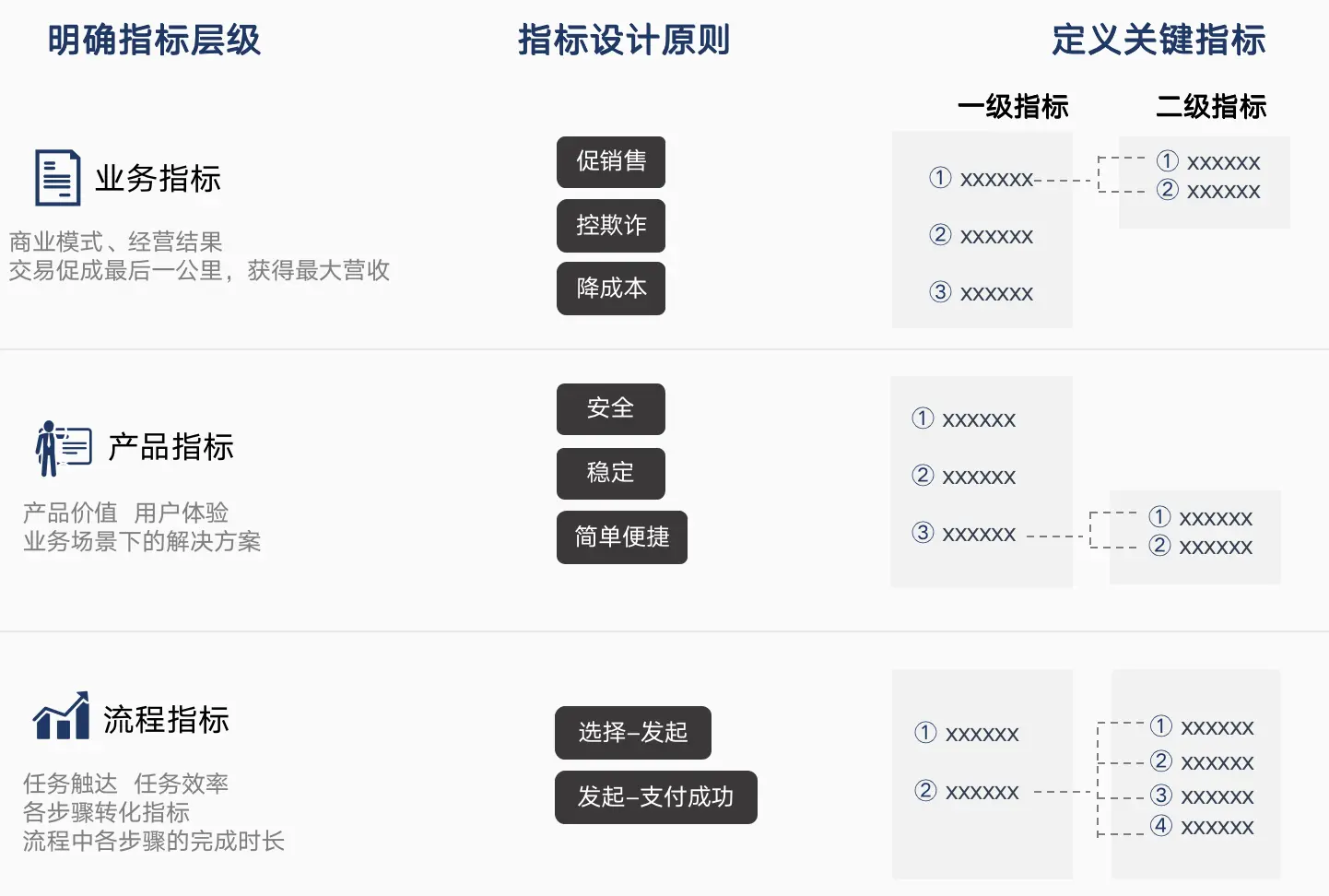 基于此,一开始就把指标进行分层级,分为业务、产品和流程三个层级,业务关注业务的,产品关注产品的。不同层级的指标有不同的思考维度和分析方法。