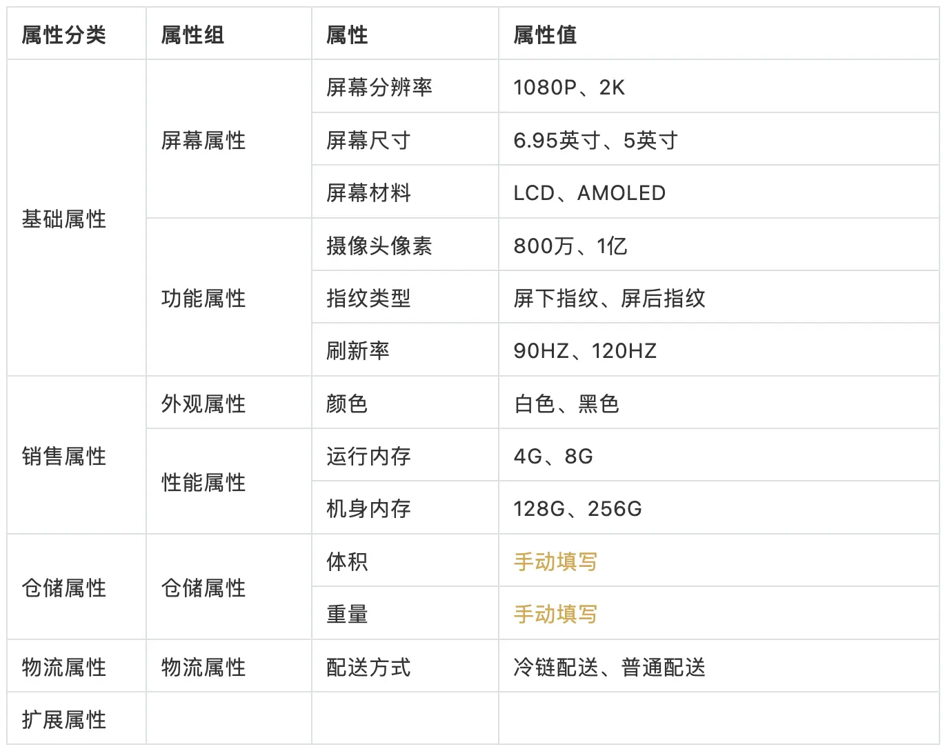 下面将属性分类结合3个核心模块,以手机品类举例,通过一张表格解释一下属性的各个概念: