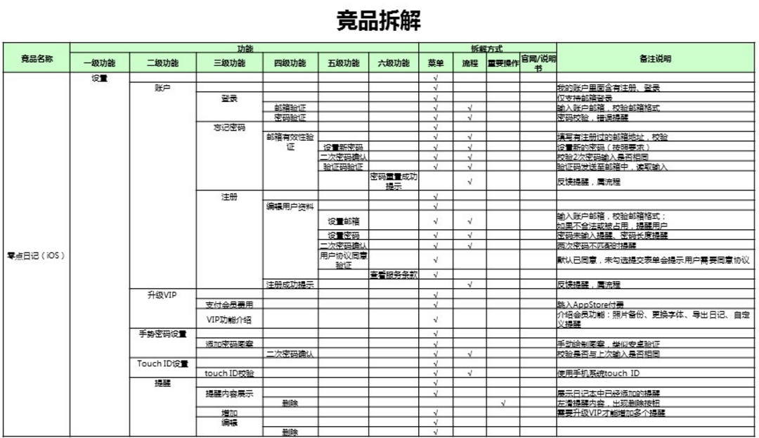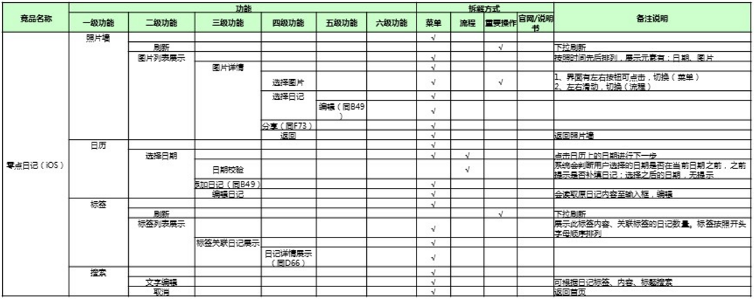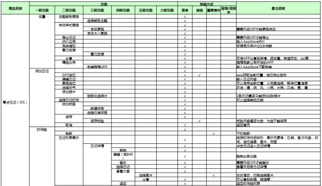 最后给到大家一个竞品拆解的实际案例。假设我们现在需要设计一款日记APP,因此选择市场上和目标产品功能完全相同的一款日记APP,进行竞品拆解。拆解成果如下: