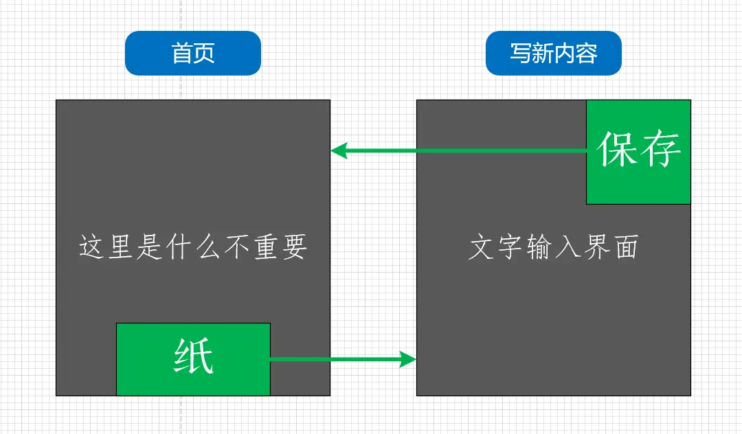综上所述,必须在步骤1和2之间加上一个“点击撰写新文字”的步骤,这样App才能获得最好的交互体验。最终得到的结论是,首页必须常驻一个空白的纸,点击或拖拽这张纸,就能立马写东西,然后单击保存就能回到主界面(如上图步骤)。