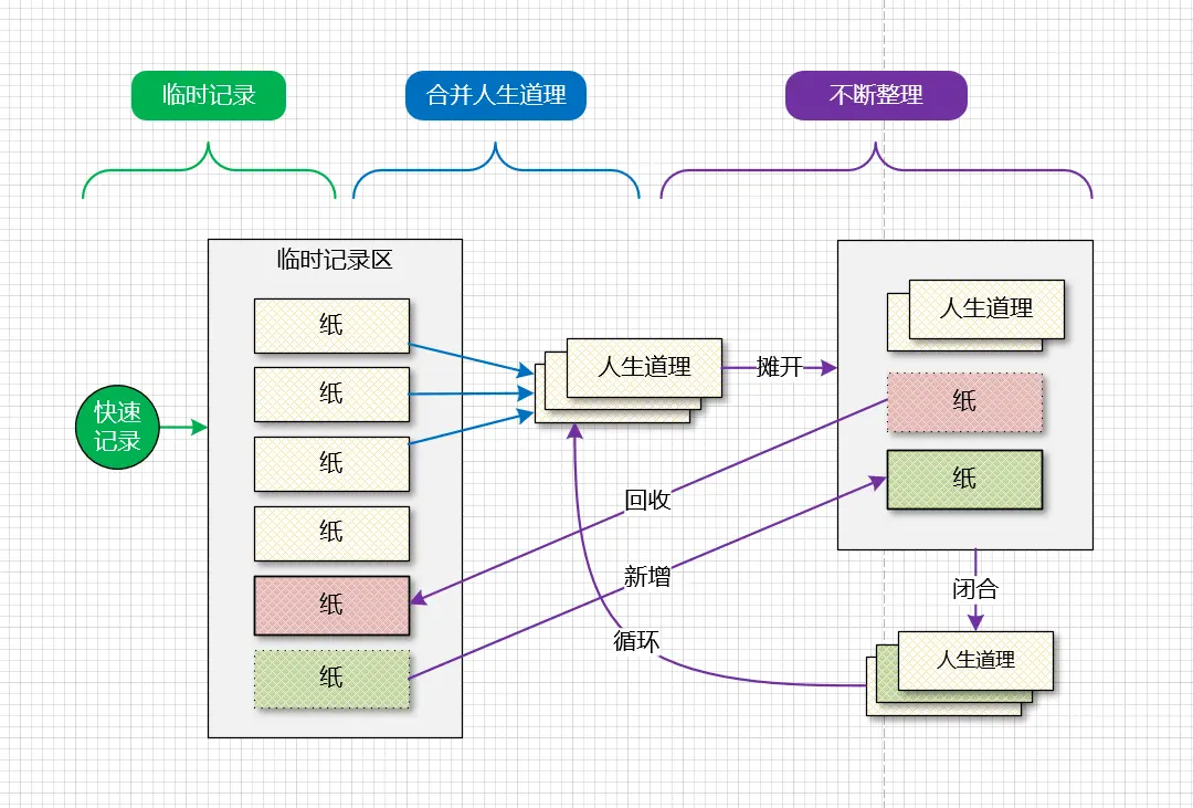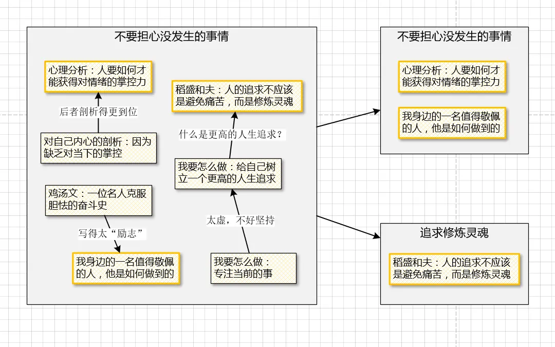 当用户形成了一个纸堆之后,他能随时去横向比较其中不同纸张的优劣,把那些过时或不够好的观点淘汰掉,精简这个纸堆。例如,小明最近发现自己最大的问题在于“担心没发生的事情”,他经常写一些关于这方面的感想,也经常收集一些知乎、壹心理、朋友圈、书籍上的有用文章,并且把它们都整理到了同一个纸堆里。随着他在生活中用实践来克服这个问题,他对这个问题的理解就越来越深刻,那么他就可以定期回到这个纸堆,淘汰掉那些不够深刻的文字,只保留对自己最有帮助的文字。同时,这个过程中也伴随着会发现一些超越这个话题的存在,那么小明这时就可以去为它开辟一个新的人生道理。就像上���所示的那样。
