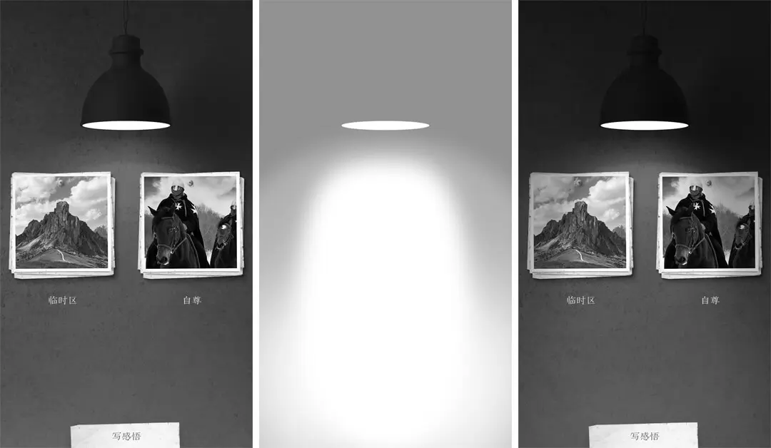 最让我兴奋的是我发现了如何让整个首页突破静态PNG切图拟物的局限,达到真实光照效果的办法。我用通道+笔刷做了一个半透明的阴影覆盖层(上图中间),放在场景图层的最顶部。这样,滑动到屏幕两端的纸堆就会逐渐被阴影所吞噬,而中间不受阴影层所影响的部分,在对比之下看起来就像是被吊灯照亮了(上图右)。