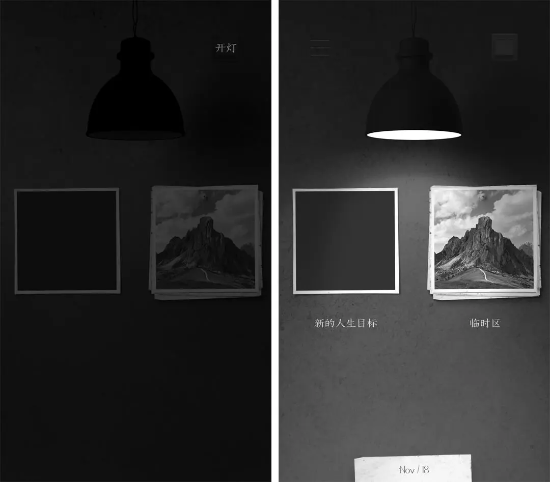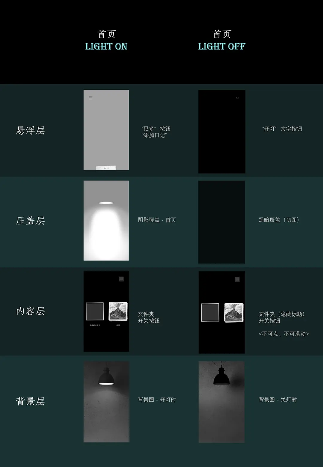 最后,我想着,既然强调了光影的变化,不如再做极致一些吧。于是我花了一两天的时间,给首页设计了开/关灯的交互效果。「the App」在未来很多用户的手上是个很隐私的东西,没人愿意在「the App」里写上“我很懦弱,从今天开始我要采用××办法改变这个现状”然后被其他人随意翻阅。所以,关灯的状态刚好可以做成锁定界面,如果用户设置了密码,那么这个界面就会显示密码盘,解锁之后才能开灯。