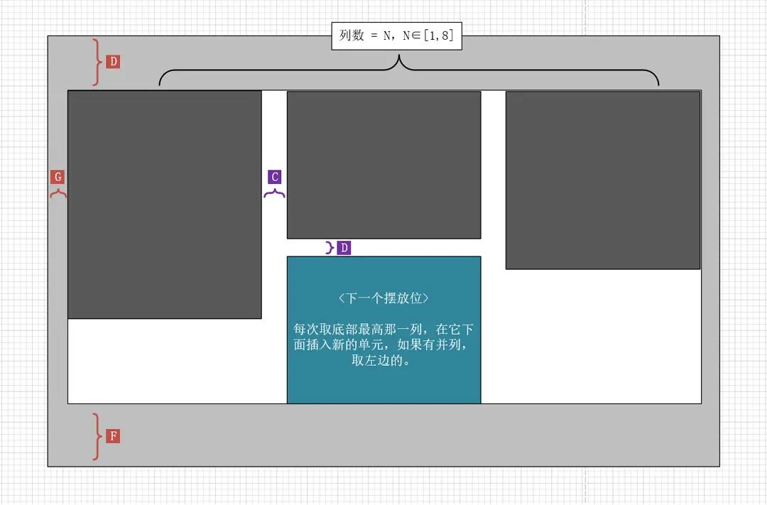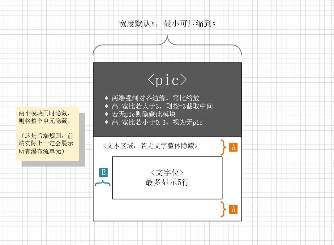 用Visio做就不同了,见上图,首先来定义瀑布流的单个“零件”。实际上还有一些图中没有说清楚的细节,例如文字位如果超过5行要怎样设计“展开”方式,以及整个“零件”的热区构成……这里只是大致的示例。