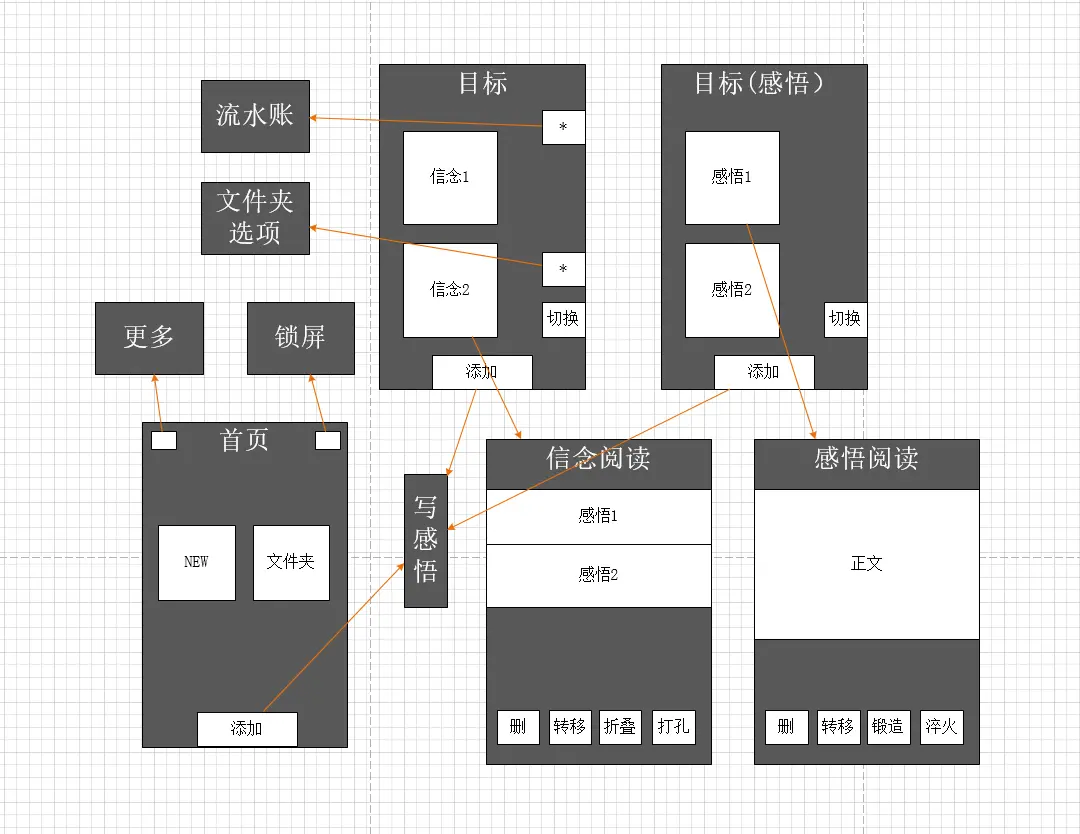 见上图,实际上,初期阶段的原型比上图的要复杂很多倍,到处都是密密麻麻的灵感和连线。这里为了你看得清上面的字,我就把它简化了一下。每当我想到一个新点子,我只需要画一个方块,然后在方块里写上几句话用来备忘;当我想细化它时,我就把这个方块做成一个稍微详细一点的页面,然后用箭头把它连接到某个地方。