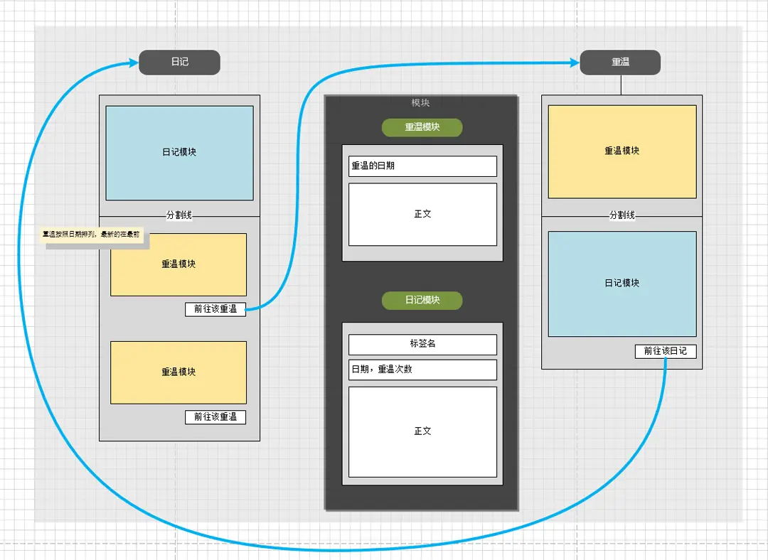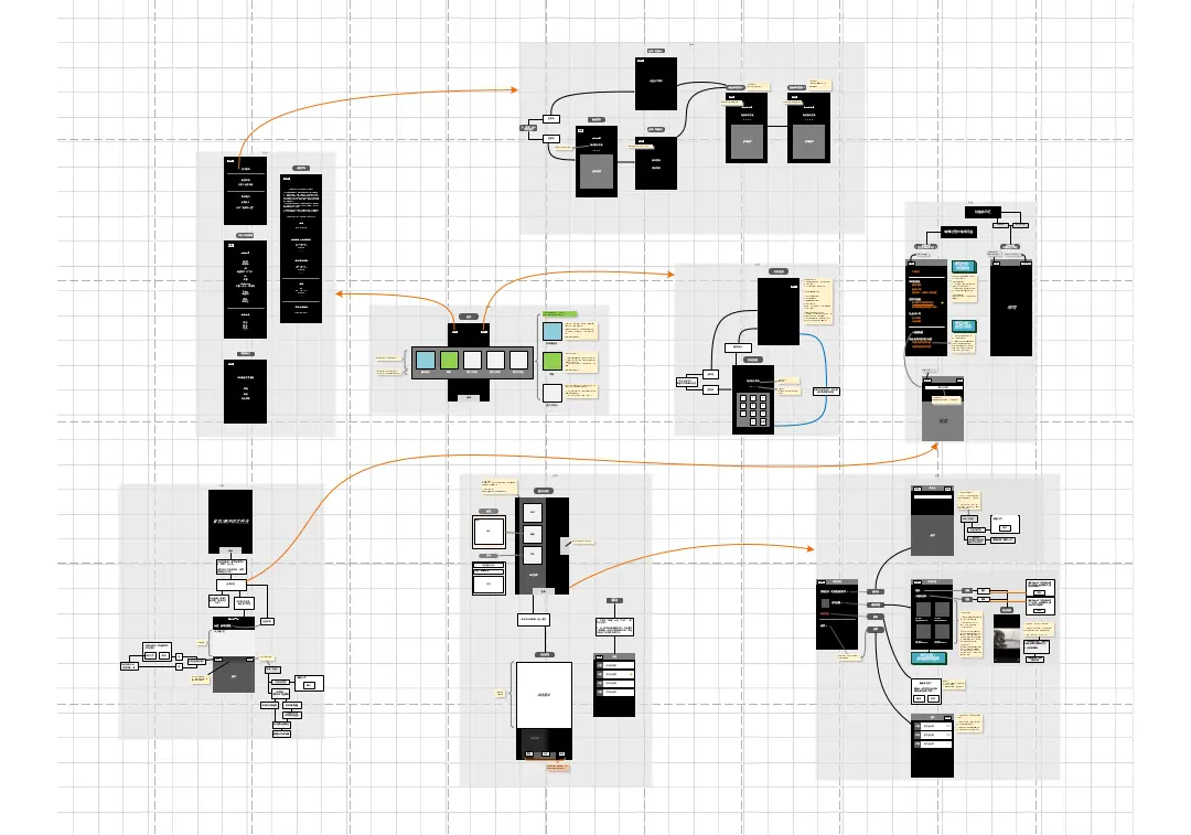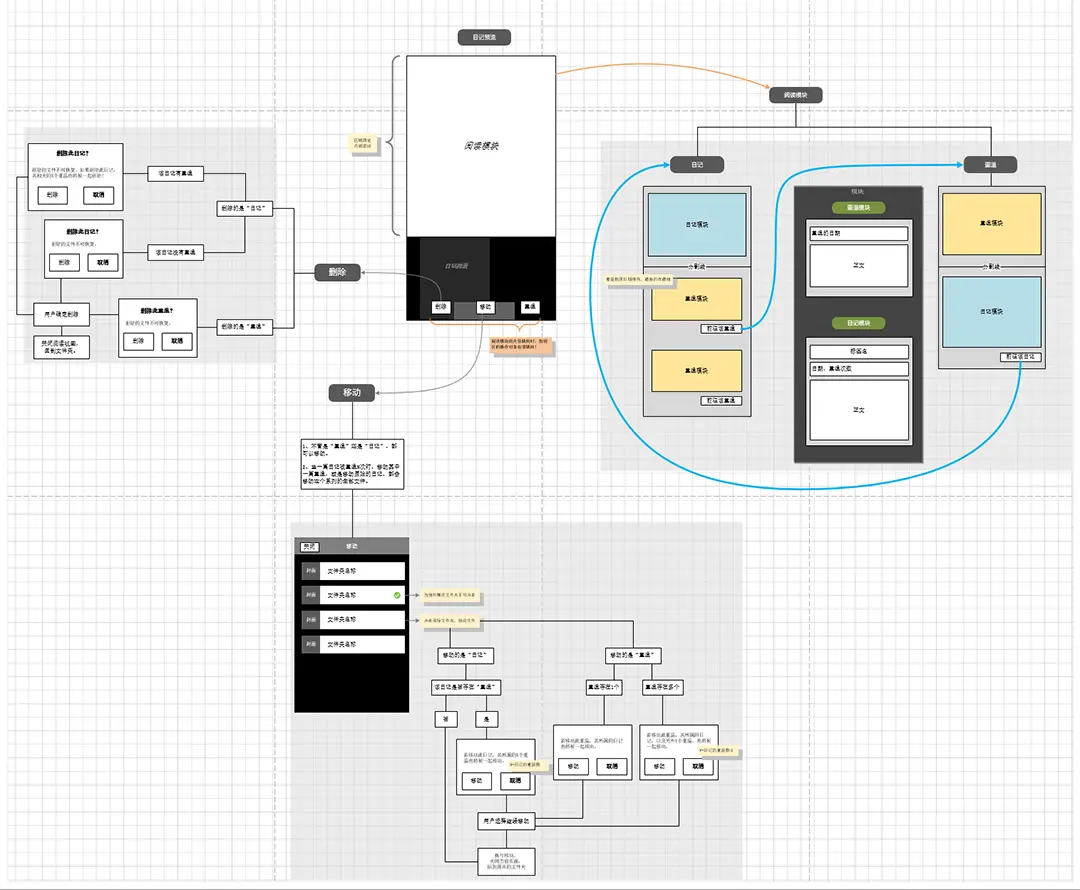 一眨眼,整个原型变成了上图的样子(上图只是案发现场还原,因为当时的原型已经直接被继续细化了),一个有大概流程的原型稿。你可以注意到,原型已经被若干个灰色的“容器”分割成了几块,这样做的原因在于,当你开始细化某个模块时,它的内容就会越来越多,内部的箭头和连接线也越来越多,如果不用容器装起来,那么内部、外部的连接就会混杂起来,让你难以专注。