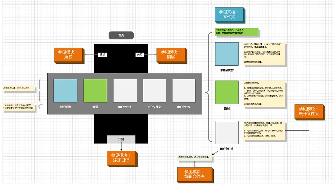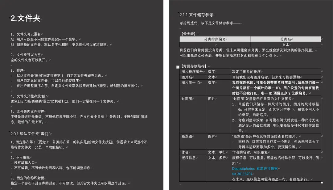 Visio原型比较善于表达前端的流程或状态机的逻辑,而如果你想要详细阐述某个系统的原理就比较难了。「the App」中“文件夹”这个概念,在Visio中主要描述的是看得到的部分,而看不到的细节就要用Word文档来描述了(上图左),例如:文件夹是否可以重名?是否可以为空?两个栏目的文件排序规则分别是什么?这些东西在Word文档中用论文的结构可以很轻松地交代明白。