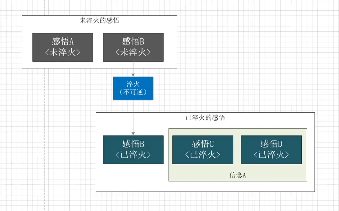 如上图,从后端来讲,“感悟”包括“未淬火”和“已淬火”两类,而“信念”则应该定义为:个数∈[1,限定额]的若干个“已淬火感悟”的“组”——它们并不是平等的。但前端设计上它们有很多类似的地方。
