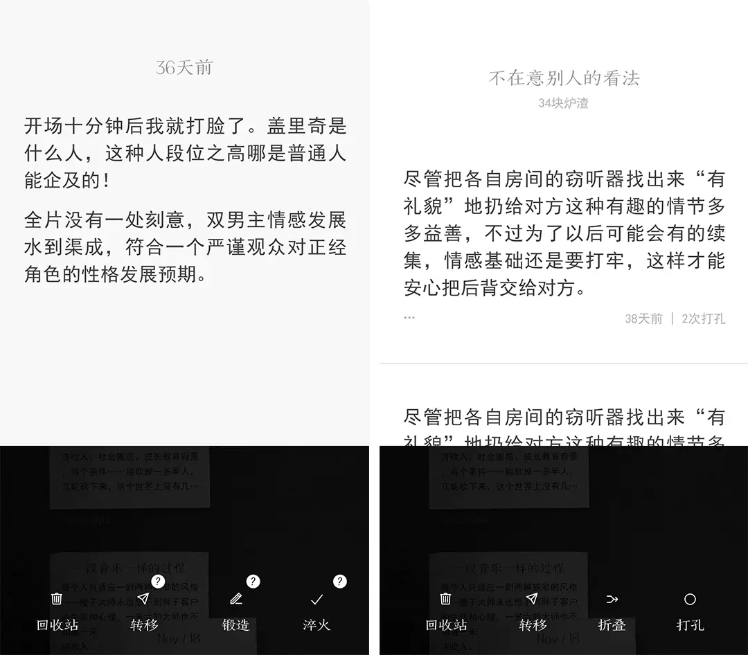 如上图,左边是“感悟”的阅读页,右边是“信念”的阅读页,它们阅读区域、删除、移动功能都是相近的,只不过是有一些细节的区别。