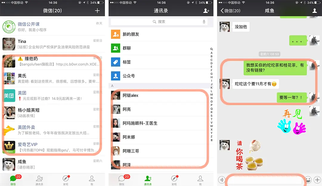 以微信为例,不论微信迭代多少个版本,它始终是一开始那个“取代手机发短信功能”的App(也许你已经忘了,以前人与人之间是用短信来沟通的)。第一栏和第二栏永远是消息列表和通讯录,就算朋友圈是中国最大的社交圈子,游戏栏目是中国最大的手游流量入口,它们都不可能突然跳出来影响你的日常使用。“人”永远是通讯的主体,即使后来出现了公众号和应用号,它们也永远是被收纳在一个次级入口之中。