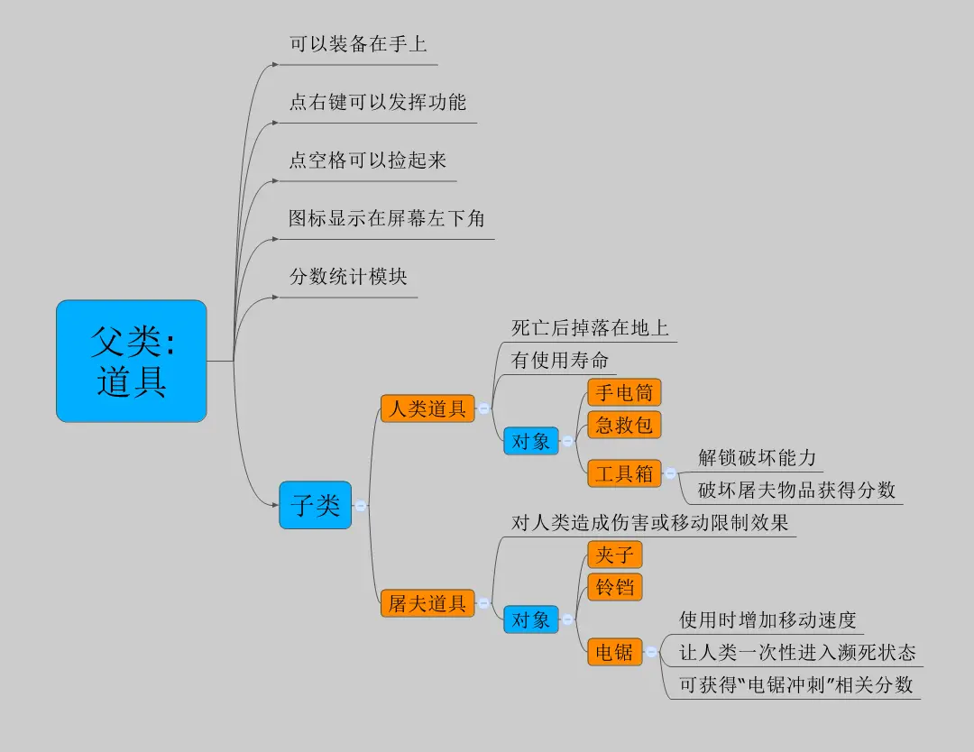 如上图,实际上,在《黎明杀机》中,所有的道具都有一个通用的模板,这个总的模板就是“父类”,在此基础上细分下去,形成各有特点的屠夫和幸存者道具的“子类”,直到最后,变成实实在在的,某个具体的可以拿在手上的“对象”,例如工具箱和电锯。