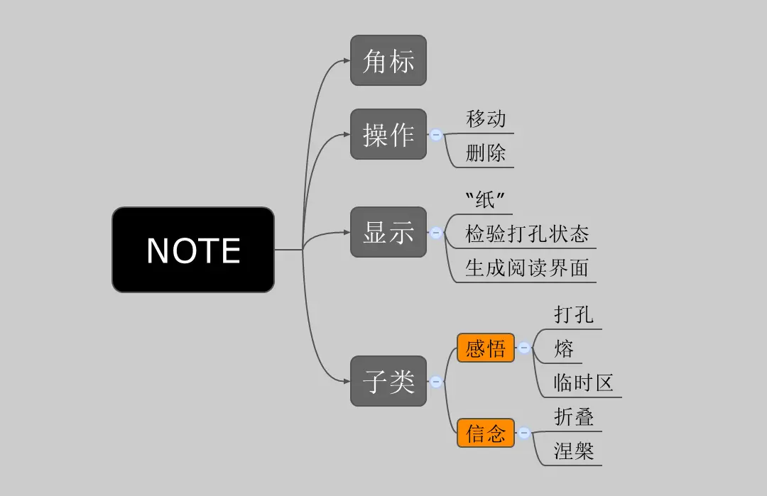 上面列举的这两件事,是把“信念”和“感悟”在原型层面能看到的一些相同之处归纳起来,让它们共享一些模块,但这种抽象能不能更高级一些?我发现一个现象:虽然“信念”在概念上是“感悟”的组,它们级别不同,但是在整个原型中它们很多的处理逻辑都相同,例如:移动、列表展示、打孔……这是因为在视觉设计上,它们只是不同类型的“纸”,必然会有很多雷同的地方,所以,何不直接把它们划分到一个“类”?
