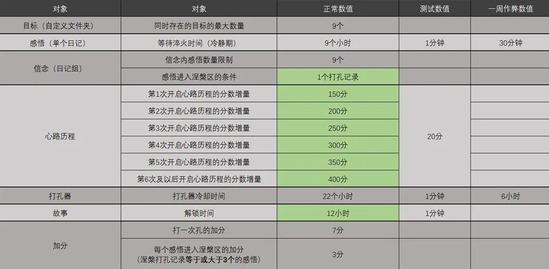 “宏”一般用来归纳那些App中零散出现的,但是不便于统一成某个模块的东西。上图是一个用来归纳「the App」中所有后期可能要变动的数值的Excel表格,例如,打孔器的冷却时间是多少个小时?打一次孔的加分是多少?每个信念最多能容纳的感悟数量是多少?……这些数值我无法一次确定下来,需要在试用过程中不断调整,显然,如果我今天在A文档里去改数值α,明天在B文档里去改数值β,我和智超之间至少有一个人会疯掉的。