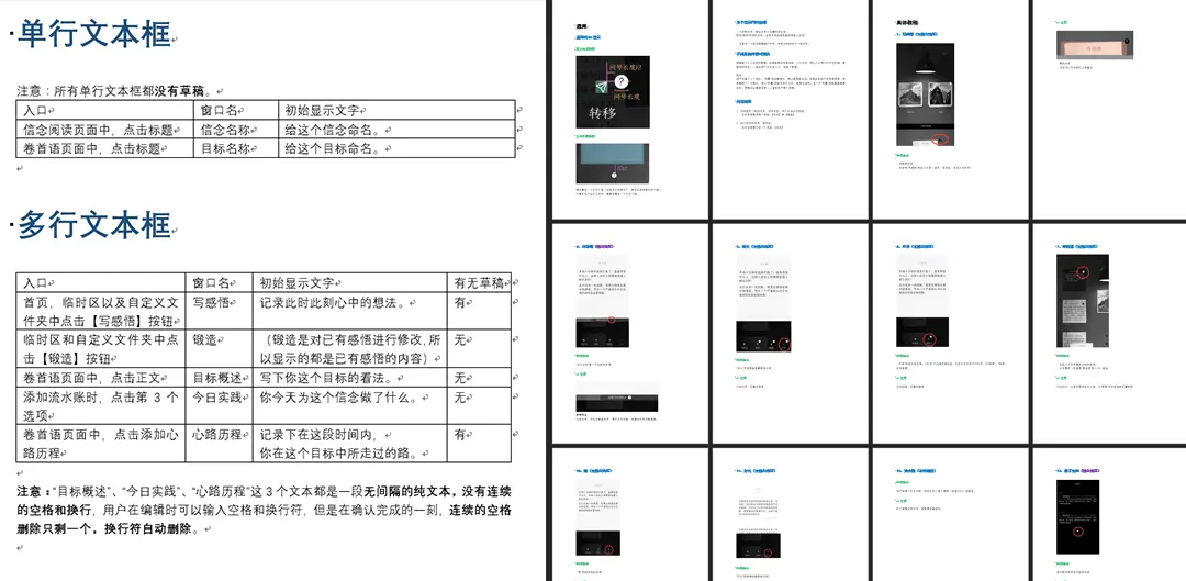 最后一种情况是“集中说明”,顾名思义,「the App」中很多东西是零散的,不便于在主文档中出现的。例如左图归纳了App中所有出现的文本输入窗口的具体属性,包括它们的窗口名、初始文本……这样我在原型中就不必列举每个文本输入页面的具体属性;再例如右图归纳了App中所有教程的出现时机、地点、展现方式,同理,这些凌乱的东西根本不应该出现在主文档不是吗?
