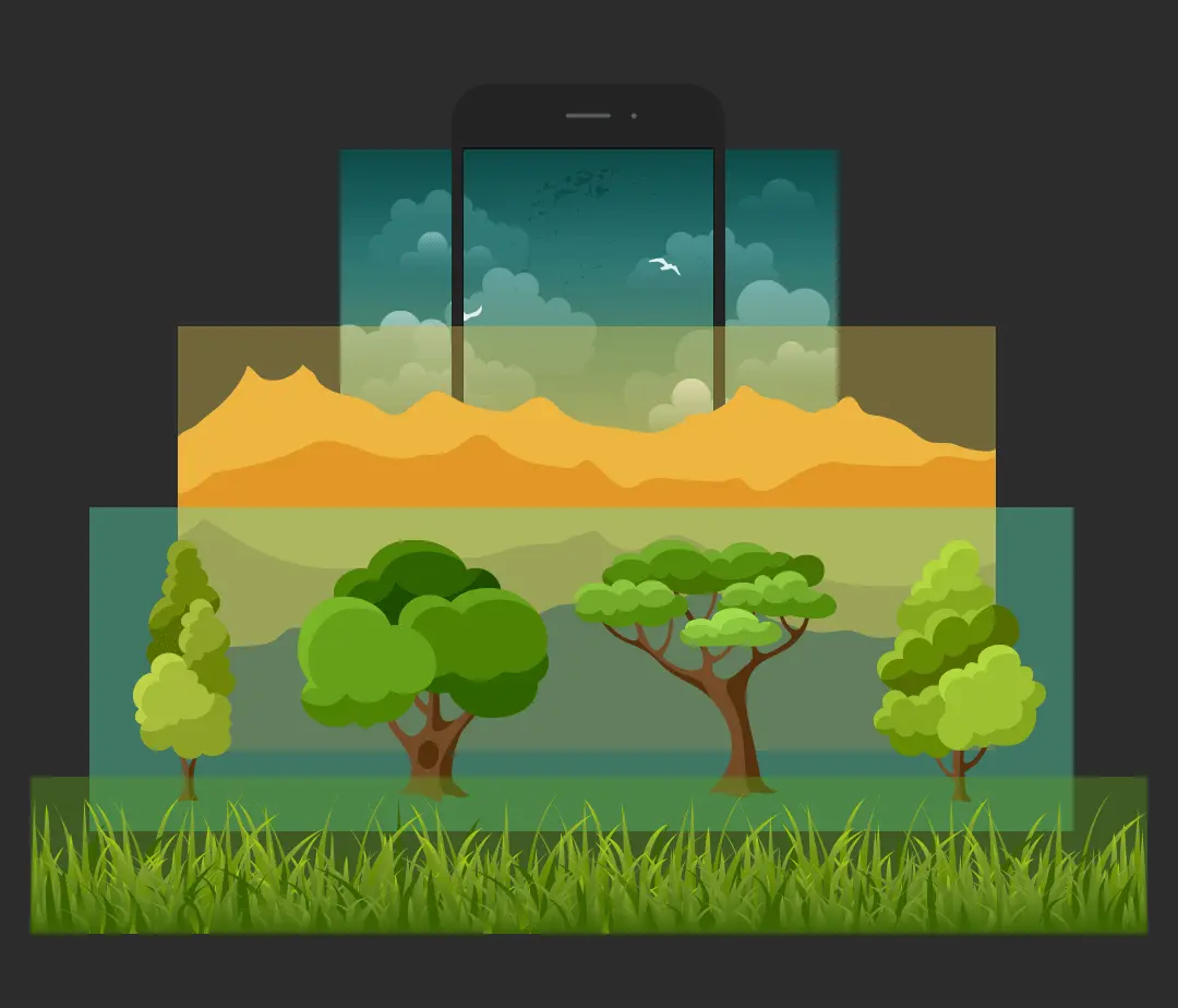 而如果采用2D的方案,草原作为主场景实现起来并不困难,如上图,场景从近到远分成若干个图层,最近的前景(小草、杂石等)尺寸最长,而最远的天空背景尺寸最短。在iOS前端,我们只需要定义一条规则:滑到最左边时,所有的图层都靠在屏幕最左边;滑到最右边时,所有的图层都靠在最右边。那么自然地,当用户滑动屏幕时,他会发现前景滑动得很快,而背景滑动得很慢,不同的图层都有不同的速度,于是就形成了透视的感觉。