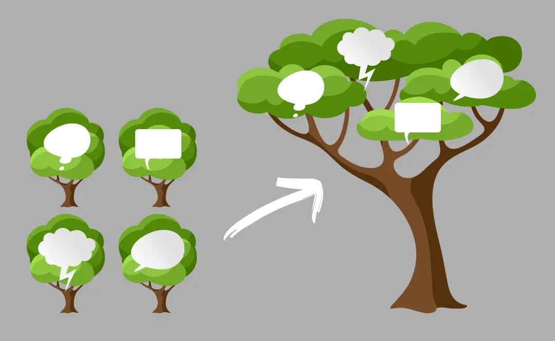 首先,如上图,我的App不可能设计成用户写的每一篇文字都算作一棵树。因为这个App的其中一个核心特点就是避免像日记或笔记应用那样:你收集了大量的文字,却发现很多文字讲的是同一个人生道理。我们必须把相同的人生道理归纳在一起,让它们组成同一棵树。例如,如果你收集了8篇文章,讲的都是关于“怎样利用好自己的内向性格”这个话题,显然它们应该放进同一个树里,而不是每次阅读他们都要去找到8颗不同的树。