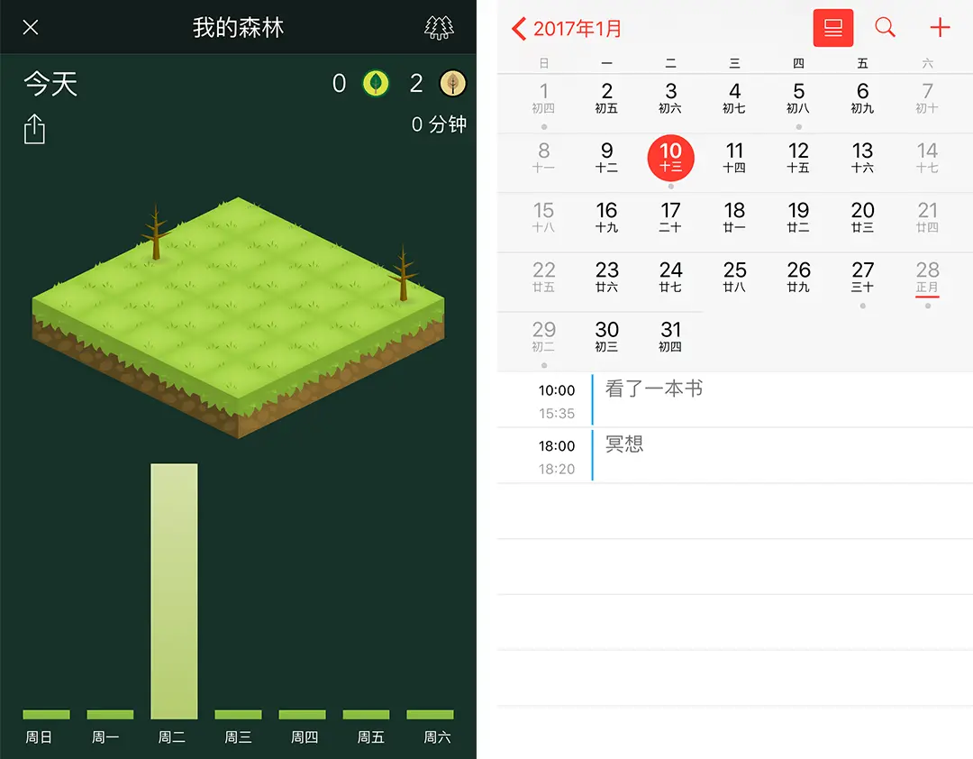 上面提到的3D和2D方案,它们的出发点都相同,那就是一个具有感染力的情景是最能打动用户的。例如左图这款风靡Appstore很久的时间管理软件Forest,右图是我把它迁移到一个普通界面后的效果,左右两个App功能完全相同,但如果它是右图这样的界面,你还有冲动去购买它吗?把产品的主线功能巧妙地融入一个情景之中,用App来打造这个情景,用这个情景的感染力来给用户洗脑,我至今仍然认为这将是成功速度最快的方案。