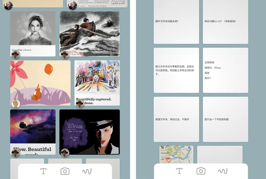既然定好了要做专业化的工具,那么我就去找参照。从我下载的众多App中,我发现了Paper 51,这是个了不起的参照样本,因为它不光能像便签、日记那样快速写东西,而且用户写的每条内容都是一片纸,这些纸张能自由拖拽,堆叠在一起,形成一个个纸堆——没有比这更直观的文字整理方式了(很遗憾,上图并没有展示纸张堆叠起来的效果,因为在截图时我发现,新版Paper51已经放弃了这个设计)。