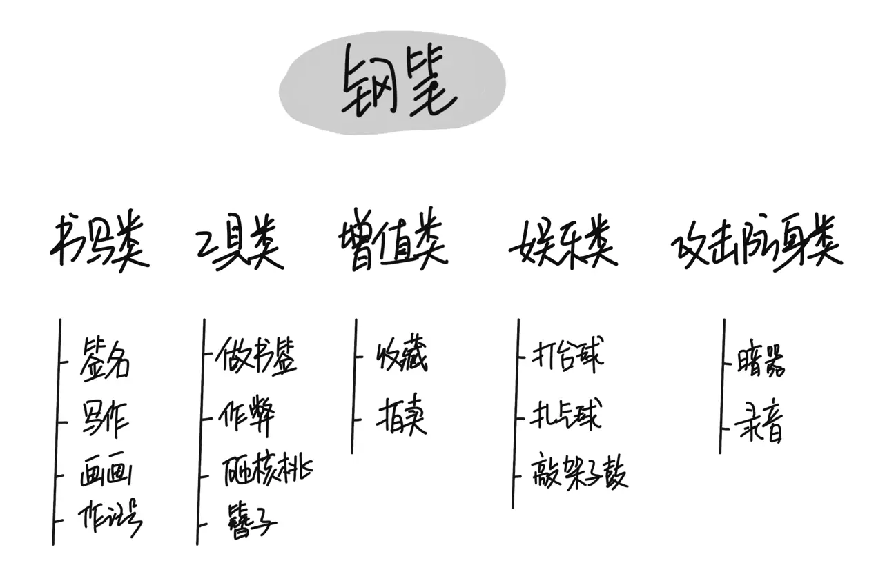 B的回答:我将钢笔的用途分了五类:书写类、工具类、增值类、娱乐类、攻击/防身类。